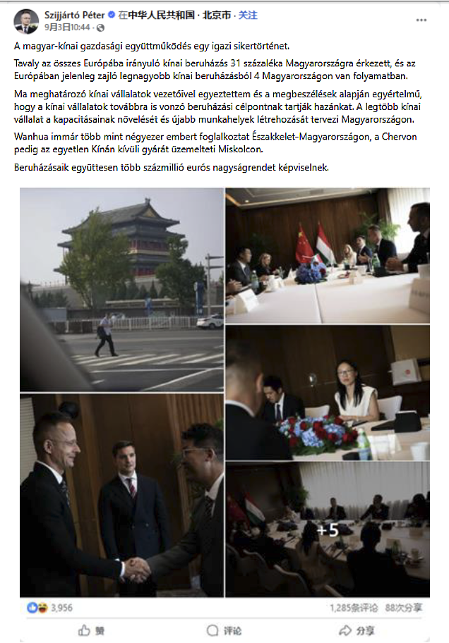 2025年9月3日,匈牙利外交與對外經(jīng)濟(jì)部長西雅爾多在北京參加完紀(jì)念中國人民抗日戰(zhàn)爭暨世界反法西斯戰(zhàn)爭勝利80周年閱兵活動(dòng)后,同在匈牙利投資的中國主要公司領(lǐng)導(dǎo)人進(jìn)行了會(huì)談。